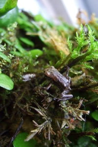 昨年 オタマジャクシから育てて、うちの庭で大人になったケロたんとビッキー。蛙を飼育して、人工冬眠をさせるというのは私も初めてなので緊張しました。でも、無事に乗り越えられたようです。湿った土と葉っぱにくるんで水槽に入れ、ベランダのロッカーの暗所に置いておいた。その水槽をそっと取り出しました。二匹とも特にやせ細った感じも無く見た感じ異常なし・・・土の色に合わせて若干茶色に体色を変化させております。まずは暖かい日向にてリハビリをさせ、小さな虫を与えて元気になってもらいましょう。