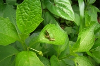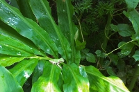 カナヘビはその後 涼しい木陰の葉っぱの上に放してやりました・・・