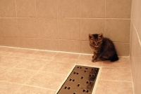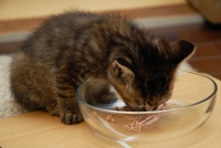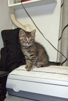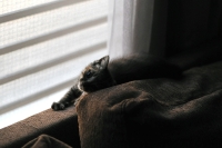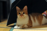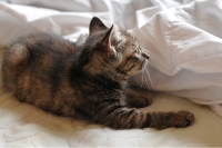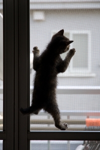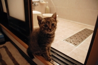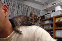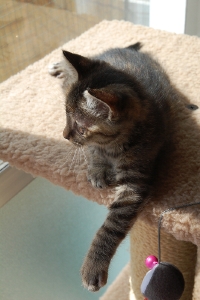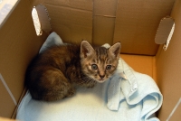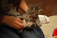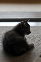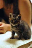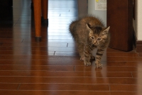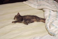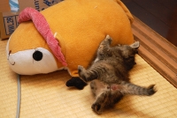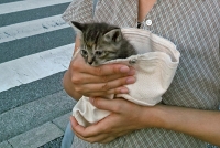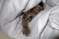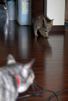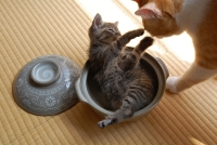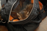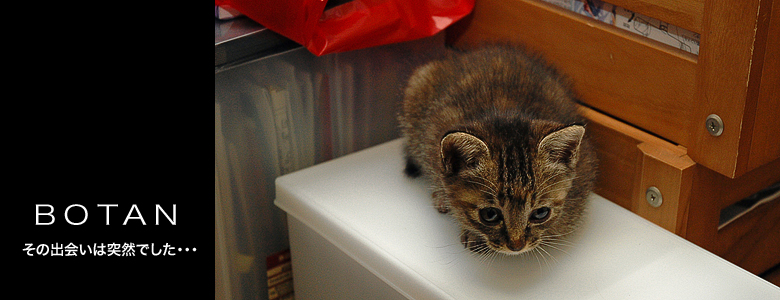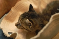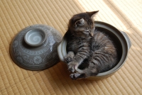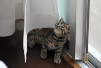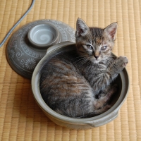 このまま放っておかれたら死んでしまうと言うことで、その場で井戸端会議を開きました。最初は皆口々に仔猫を捨てた人間への批判のことばを。そして仔猫の行く末の心配について・・・とにかく見て見ぬふりは出来ない状況だったのです。結果として、二匹のうちの一匹は近所のおばさんの一人が引き取ることに、さてもう一匹が残りました。その仔猫はグレーのトラ柄で、なかなか端正な顔をしています。大勢の人間に代わる代わる撫でられて、最初は怯えて震えていましたが、抱いているうちに落ち着いて大人しくなりました。うちの嫁さんが一時預かろうと言い出したので、そうなりました・・・帽子に入れて胸に抱えてそっと連れて帰りました・・・