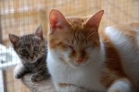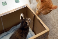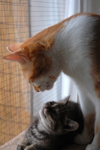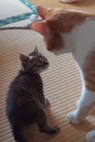 小太郎はしばらく、この新顔の臭いを嗅いでいましたが、特にそれ以上ちょっかいを出す様子も無さそう。仔猫の方も小太郎に対してほとんど怯えませんでした。なかなか度胸のある奴です。ちなみにこの子は男の子。体が少し汚れているので、これからお風呂に入って綺麗になってもらいましょう。