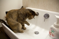 このところ ぼたんは洗面所の流し台を占拠したりします。