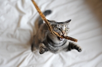ゴムひもの先にねずみのフェイクが付いているもの。
