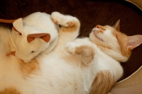 小太郎とぼたんが座布団の上で一緒にぬくぬく