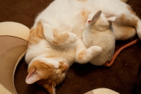 写真 こたつでぬくぬくのぼたんと、私の寝間着の上でくつろく小太郎