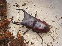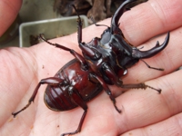 ずっと昔、カブト虫を飼育していた時の経験では、カブトは羽化から一週間ほどで体が充分硬くなったと記憶していました。そこで、オオクワガタも同じだろうと思いこんだ・・・ところが、判断は間違っていました。まだ体の堅さが不十分だった。角をつかんだところ、クニャっという感じで曲がってしまいました。その後、その個体は角が変形したまま体が硬くなってしまった・・・かわいそうな事をしたと反省・・・