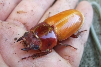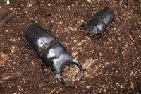 甲虫の場合も さなぎから出た直後に試練が多々存在します。いわゆる脱皮という儀式は、体が最も柔らかく 病気や外敵に襲われる可能性が一番高い時期。運悪くカビの胞子などが体に付着していたりすると死んだり、羽化不全といって「失敗」します。毎年数%の発生率に見舞われています。今回も有りました(開けた瞬間に思わず後ずさりします)結果、雄8匹、雌10匹が無事大人になりました。羽化してまだ数日しか経っていない個体は、写真の雌の様に体が赤っぽい色をしています。