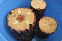 産卵の為の朽ち木を産卵木と言いますが、これはクヌギやコナラの木を1次発酵させたもの。今ではペットショップで簡単に手に入ります。1本が500〜1000円程度します。産卵木はまず水に5分ほど沈めて加水します。参考書を読むと30分ほど水に浸けるとありますが、それでは水を吸いすぎると私は思う。人によっては買ってきて直ぐにマット(土)に埋めて、自然に湿った状態になるまで待つという方法もあるそうです。