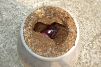 菌糸瓶を開けた時に出る不用な土を使って埋め戻します