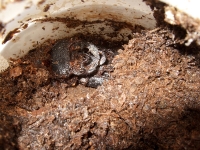 写真は羽化したばかりのオオクワガタの雄。オオクワガタは羽化してから活動を始めるまで、少し時間が長めです。約2週間程度は、羽化した場所でじっとしていて体が硬くなるのを待ちます。カブトムシなどは数日で直ぐに体が硬くなるのでその差は大きい。ご覧の様に赤い状態のうちは、まだ動けません。角も柔らかく強く押せば曲がってしまいます。この状態の時には、本来触ったりせずにそっとしておくべきでしょう。私は写真記録に撮る都合で、そっと扱いました。用意した小型の水槽に隠れ場所を作って、そこに待避させました。餌を食べ始めるのもまだ少し先になると思います。