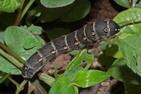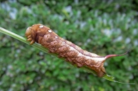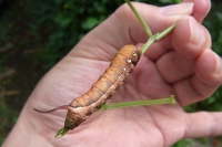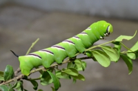 まるまる太って既に終令に達しています。実は一週間ほど前にも一匹いたのだ。その個体は緑色のコスズメ蛾の幼虫でした。っで、こいつは褐色系ですが、同じ種類でも幼虫が緑と茶に分かれる事はあるらしい。でも、体表の模様が割とくっきりしていてコスズメ蛾にしては派手かな。似ている種類にベニスズメ蛾がいます。すぐに結論は出せませんでした。