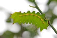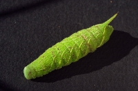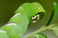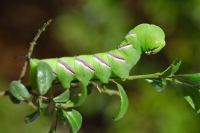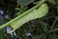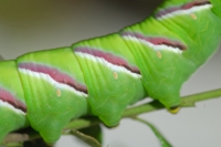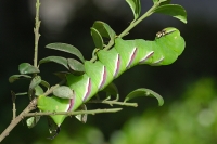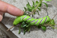 ところが昨日、その本体をいきなり発見!実に鮮やかな黄緑色のスズメガの幼虫です。背中に紫色と白の模様があり、もの凄くハイカラなコントラスト。何でこんなに目立つ奴を見つけられなかったのかなー(大汗)同タイプの幼虫は10年位前に一度見たことがあるな・・・スズメガの仲間であることの証拠は、お尻の先にピンと一本角が立っていることです。大なり小なりこの角は共通しています。