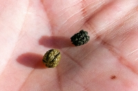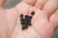 あと・・・駐車場には実は別のタイプの大きな糞も落ちています。そちらはキンモクセイの木の下にぽつぽつと。問題はサイズで、コエビガラスズメの幼虫のものより若干大きい(写真5番目の左)そこから推測される芋虫毛虫の体長は10cmに達するのではないだろうか?そちらの主はまだ見つかっていません。一体どんな奴なのか私の関心は高まる一方です。