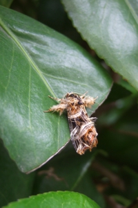 この蛾の幼虫は1シーズンに何度か発生するみたいですが、遅い組は比較的ゆっくり成長して秋口に越冬するための堅い繭を作ります。問題は こいつが強力な毒針を持っているので、先日コメントしたチャドクガと同様注意しなければならない存在であること。大きくなっても動きが緩慢な奴なので 以外と見つけにくかったりする・・・