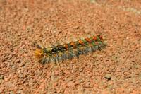 今日道ばたでとても目立つ昆虫を見かけました。見ての通り大変カラフルで毒々しい形態をした毛虫です。今まで数多くの幼虫を見てきた私ですが、日本でこんな奴を見たのは初めてですね。 どんな蛾の幼虫なのか想像が付きません。