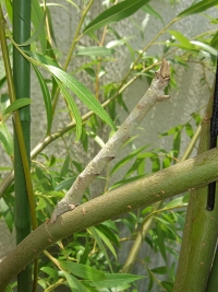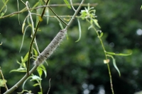 見てのとおりコレは尺取り虫です。かなりの大型!庭の柳の木に付いていました。枝を少し剪定しようとしたら、中途半端に伸びた枝があったので「おやっ!?」と思ったのです。よくよく見てみたらやっと分かった。写真でこうして見ると、あきらかに他の枝とは違うので分かるのですけれど、木や草を見ている場合、全体を見ているのであって細部には意外と目が行きません。だからこの程度でも「全く気がつかない」ことが当たり前かと思います。