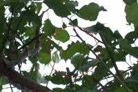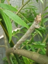 このトビモンオオエダシャクの幼虫は、私の小指ほどの長さがありました。そして後ろ脚で枝に引っ付いている力がもの凄いこと!引っ張っても取れませんでした。無理にはがそうとすると、体が千切れてしまいそう(嫌)途中で怒って威嚇していました(写真 右)スミチオンを噴霧して弱ったところで退場して頂きました(ごめんね ^_^; )