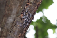 一網打尽にするには、やはり木全体に広がってしまう前に駆除するのが手堅いのです。多くの蛾の毛虫は、小さいうちは寄り添って固まって過ごす習性がある・・・そこが狙い目。チャドクガに続き手を打てたのはもの凄く朗報でありました!そして、イラガの孵化する時期が判明したので、ここしばらくは他の集団(コロニー)が無いかどうか気をつけることにします・・・