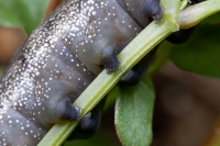 こん回ネットでスズメガの幼虫をぐぐってみましたら、コエビガラスズメという種類のようです。紫と白の模様が決め手でしたね。以前にも書きましたが、芋虫毛虫の類が気持ち悪いのはその形状と模様からくる嫌悪感が強いのでは無いでしょうか。一度視界に入ってしまうと、その存在のインパクトは簡単には消せません。緑の中にいる場合は、保護色で見つけづらいのに・・・芋虫は、触ってみるととても弾力があってどちらかというと堅い皮膚をしています。このコエビガラスズメの幼虫も例に違わずザラザラして堅いボディでした。ちょっと押した位ではへこみません。芋虫を触ろうとする人は極めて少ないと思うので一応貴重なレポートとして書いておきますね。ちなみに毛虫は毒があるタイプが多いと思われるので、そちらは触ったりしません。念のため・・・