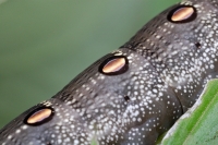モモスズメガはご覧の様に全身に堅そうな突起があり、全身が鎧の様です。触ってみるととてもザラザラして、まるで猫の舌みたい(或いは鮫肌の感触?)私は毛虫は触りませんが、芋虫はけっこう平気なのであります。毒は無いし見た目が気持ち悪いかどうかだけですね・・・モモスズメガは頭の形に特徴があり、一見すると目にあたる部分が確認できません。頭のクローズアップを撮ってみましたが、やはり目にあたる器官が何処にあるのか?・・・やはり全身鎧を被っているかのようです。全身のシルエットは軍艦の様な紡錘形でとてもバランスの良い形状。芋虫の中でも美しいと言えるものではないかと感じます(よほどの昆虫好きで無いとこんな事はいいませんよね!?)