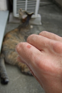 毛虫に触れるとかぶれるのは分かっていましたが、慣れた作業なので軍手もせずにやっておりました。すると・・・その時にどうやら毛虫の毛が葉に残っていたのか?何だか人差し指の背にヒリヒリと違和感が・・・