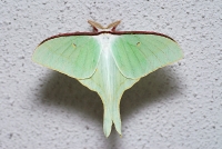 オオミズアオは2006年の6月13日のコメントで触れた蒼い蛾です。比較の為に再度載せます(下)街中でお目にかかるのは機会が少ない珍しい存在かと思います。その青い繭から上質な絹糸が採れるらしい・・・私にとっては縁起のよろしい蛾であるとも書きました。その幼虫がなんと庭にいました!!