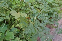 このアゲハ蝶の幼虫は、通常ニンジンの葉っぱを食草にしているハズなのですが、今回 苺の葉に群がっていました。ここは近所の道沿いにある家庭菜園の中なのです。少々荒れた畑ではありましたが、ざっと見て10匹近くいるではないですか!この畑の持ち主はこんな目立つ虫が付いているのに どうして気がつかないのか?それが私には不思議でしょうがありません。虫の為に畑を作っている人は珍しいと思いますので(笑)