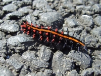 この幼虫の正体が知りたくて、ずっとネット検索で蛾の幼虫を調べていましたらやっと資料が出てきました。「ツマグロヒョウモン」蝶の終令幼虫です。ちょうど一月前に撮ったヒョウモンチョウの一種です。食草はスミレやパンジーの葉っぱ。意外と身近にいるものなのですね・・・
