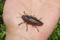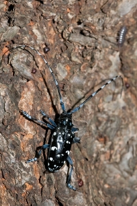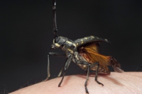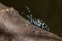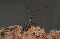 このカミキリムシも最近見かけなくなってきた昆虫のひとつですね。ヒゲを除いた体長は約3センチほど、ヒゲはとても長いです。カミキリムシは英語ではLonghone Beetle(長い角の甲虫)という呼び名です。