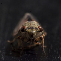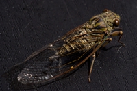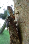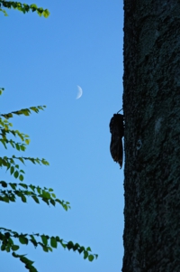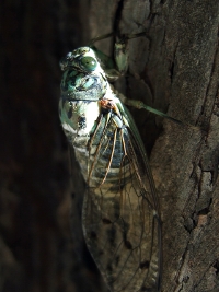 写真は昼間 地上1.5m位の木の幹にいたミンミンゼミ。普通数メートルの距離に近づく前に逃げてしまう。コンデジのマクロモードで15センチ位まで近寄りましたが逃げない・・・けっこうアップで撮ることが出来ました。つついたら元気よく飛んでいきましたので弱っていた訳ではなさそう・・・うかつな奴です。このセミも徹夜明けで注意力がヘタっていたのでしょうか・・・