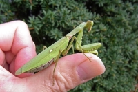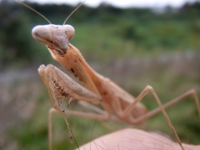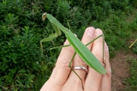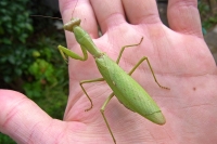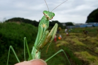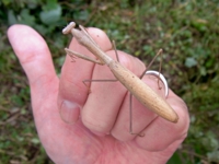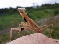大きさから言うと、チョウセンカマリキにもちょっと似ていますが、羽の横に紋(すじ)が無いのでオオカマキリかな?と思います。腹の形からして雄だと思われます。このカマキリは大変落ち着いていて、手のひらに載せても全く動じませんでした。