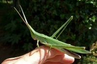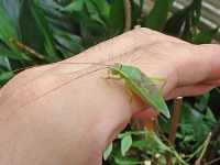 写真の通り、とても綺麗な青い色をしています。今まで数回ほど見たことがあります。昆虫図鑑で調べてみると、何でも明治の頃に 外国から持ち込まれた草木に付いてきた外来種だと書いてありました。日本にもともといるマツムシは茶色でコオロギの様な色。「チンチロリン」という鳴き声は日本のマツムシの声です。アオマツムシは「チッチロリ、チッチロリ・・・」と弱々しく鳴くと記述されている。ネットでその声のデータがあるかどうか検索してみましたら、ありました。