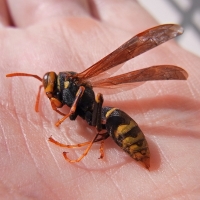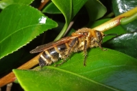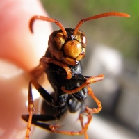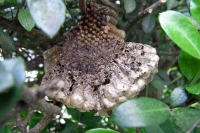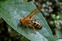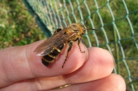 ちなみに 先日・・・うちのアパートにある灌木に、スズメバチなどの危険な蜂では無さそうな奴が留まっていたので写真を撮っておりました(右)てっきりみつばちの女王蜂かと思ったのです。でも 後で調べてみると、微妙に違う感じがします。全体的に少し細身でラインがシャープ。みつばちの女王蜂はもう少しずんぐりして色も薄いと資料にはある。分家して新しく飛び立った若い新女王だからか?とも思いましたが、現状ではその正体が判定できません。捕まえてもう少し観察しておけば良かったです・・・
