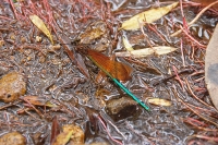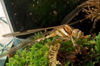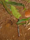 ひらひらした飛び方で、普通のトンボの様に素早くありません。雰囲気的に蛾に近いかもしれません・・・今回よく見ると、胴体の部分の色もいくつかのパターンがあるのが分かりました。中には綺麗なメタリックグリーンのものもいます。まるで玉虫の羽の様に綺麗です。右の写真は川岸に落ちていた寿命を迎えた個体。