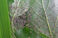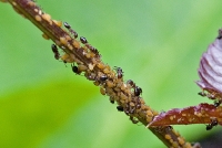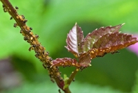 ほとんどの植物には アブラムシという小さい粒の様なムシが付きます。茎や葉っぱから汁を吸って植物を弱らせるので 人間の目から見れば「害虫」となります。見た目が悪くあっという間に増殖するので 気持ちがよろしい生き物には感じません。普段は・・・殺虫剤をかけたりして駆除する対象でしかない・・・