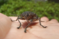 カミキリムシはけっこう動作が素早くてなかなか落ち着いてくれません。小学生の頃にも捕まえるのにはかなり苦労しました。木の上にいる場合はまず無理です。どんどん登っていってしまいます。基本的に高いところが好きなんではないだろうかと思います。また、その大顎(キバ)はもの凄く鋭く力が強いので、絶対に噛まれない様にしなければなりません。爪切りの代わりになるくらいですから。国内最大サイズのシロスジカミキリにかかれば、かみ切れないものは金属くらいでしょう?(いや、アルミの1円玉ならきっと切断できるな!)パワーにおいてオオクワガタの大顎などはその比でないのです。ニッパーの様な切れ味であります(危)あと、背中をつかんで持ち上げると、カミキリムシはキィキィと鳴くのも特徴です。それがなんかかわいい・・・