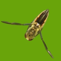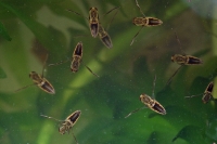 名にミズムシと付くと何だか痒くなりそうですが、これはカメムシの仲間です。水の中を長いオールの様な足を使ってコミカルに泳ぎます。でもよく見ると泳いでいるのはほんの一瞬で、ほとんどの時間は空中に静止しているが如くピタッと止まって動きません。とても不思議な生態をしています。