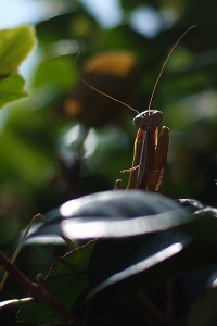 ツバキの葉の上に「チョウセンカマキリ」の雌がいました。オオカマキリに次いで大きな種類です。挑戦の意ではなく、かつて朝鮮から渡ってきたから付いた名だと記憶していますが・・・カマキリは昆虫の中ではもっとも感情の表現?が豊かな奴です。頭をちょっと撫でてあげたらもの凄く反応しました! 本能からくる自衛のための威嚇で、体を広げて「俺は強いんだぞ」と言っているのです・・・30秒くらいこのままフリーズ。