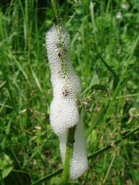 写真は「何か?」というと、アワフキムシという名の昆虫です。正確にはその幼虫が住んでいる虫の巣とでも言えましょうか。中にはセミを小さくした様な虫が何匹か住んでいます。子供の時には乾燥に弱く 大人になるまで、泡状の住宅でぬくぬく暮らしています。要するに引きこもっているのです(笑)