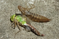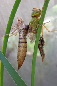 「トンボのヤゴ救出作戦」という地元NPO団体の活動で、毎年ギンヤンマのヤゴをプールから捕って来て世話をしています。せっかくなので全てのヤゴには大人になって大空へ飛んで行って欲しい・・・とんぼのヤゴはさなぎの時代が無い「不完全変態」というもの。ヤゴは水面上に出ている草の茎などに上がってそこで羽化します。