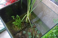 でも・・・その時点で羽化に失敗してしまう「羽化不全」というトラブルが発生する可能性は少なくないですね。多いのは足場を踏み外して水面に落ちてしまうこと。羽が完全に伸びきっていても実際に飛べる様になるには結構時間がかかります。たいていは夜中のうちに羽化して朝方飛び立っていくパターン。朝 水面に羽化したてのギンヤンマが溺れて死んでいるのを見るのは辛いです。現在では足場をしっかりする為に私はヒメガマを水鉢に植えて水槽に入れています。