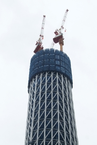 1月中旬に見かけた時はちょうど200mを超えた所でしたが、本日ではもう303mに到達。634mの半分近くになっています。これですでに東京タワーの333mに近い高さなのですが、脚部が広がっていないせいかそれほど威圧感がありません。かなり近くに行かないとその胴回り(太さ)の実感がわきません。そうとう大きいのですけれどね。