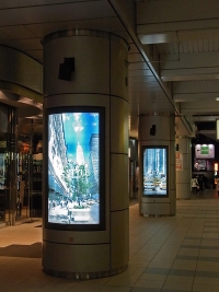 さて、最近の話をすると・・・プレゼンテーションでは、スライドショーを駆使して素晴らしい解説をしてくれる例もたくさんあります。最近ではそこに動画や音声もいくらでも貼り込める。同様に、電子掲示板自体も日々表現が進化して来ました。それが今では一気に機能アップし、しかも薄型液晶ディスプレイとの組み合わせで新たな展開を始めています。駅のキオスクにも既に設置が始まりました。秋葉原には、どんどん液晶パネルが埋め込まれた柱が増えています。