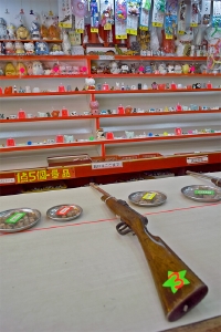 台の上に並んだ景品を「コルク玉の空気銃」で打ち落とす遊びです。
