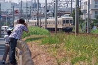 新京成電鉄というローカル線の線路際を通りかかりました。すると、やたらに大勢のカメラマンが集まっていました。っと言うことは、何やら珍しい車両が通るのだな!?とすぐに気づきました。iPhoneを取り出して、新京成のHPをぐぐってみると・・・旧型の800系という車両の引退運行があるとのこと。二度と撮れない被写体だと判ると、そのまま無視して通り過ぎることなど出来ません。それはカメラマンの性というもんです(笑)サイト情報には運行ダイヤも出ていました。今日のシャッターチャンスはたったの二回のみ!?そこで本気の鉄男さんたちに混じって、私もにわか鉄道カメラマンに変身しました・・・まずは通常の車両にレンズを向けて撮影の練習。これはテニスの素振りみたいなもんです。けっこう速いスピードなので、絶好の構図・シャッターチャンスは恐らく一度っきりでしょう。